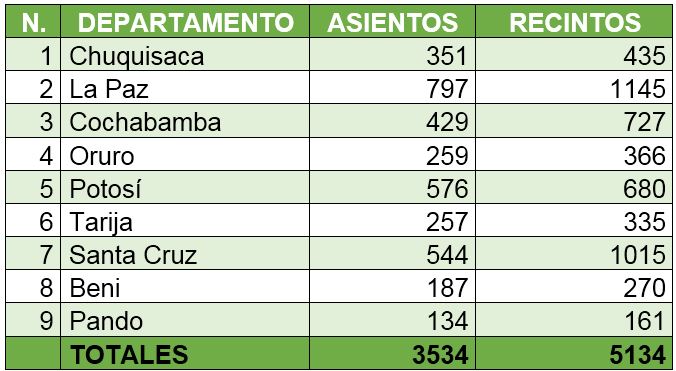 En Bolivia se ubican 5.134 recintos electorales en 3.534 asientos electorales, dentro de 63 circunscripciones distribuidas por todo el territorio nacional.