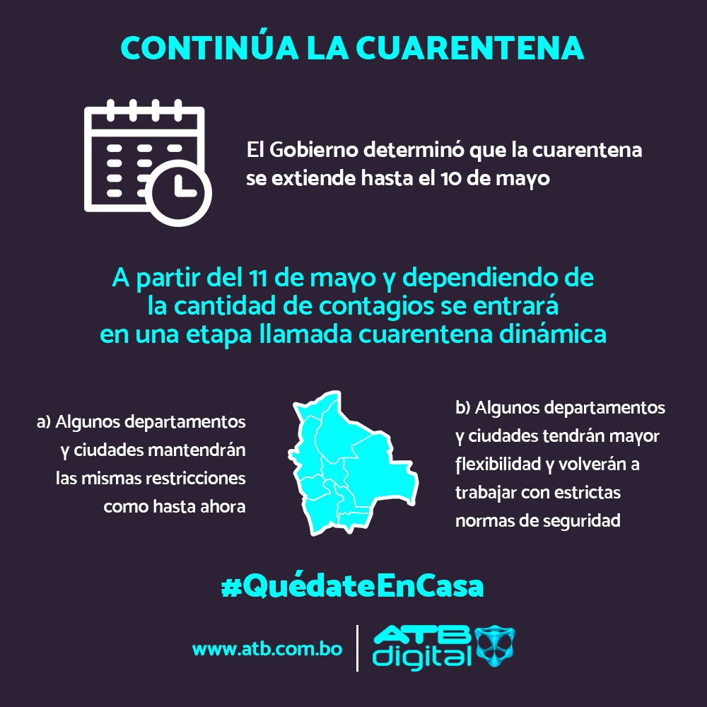 La Paz, 29 abr 2020 (ATB Digital).- El Gobierno anunció que a partir del 11 de mayo regirá en el país una “cuarentena dinámica” que implica tres categorías que serán aplicadas en departamentos, municipios y ciudades de acuerdo al avance del coronavirus. El Ministerio de Salud hará una evaluación cada siete días para determinar cuál de estas categorías se pone en marcha en las diferentes regiones del país.