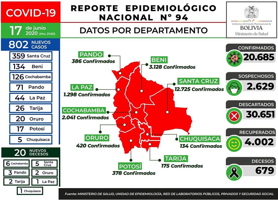 La Paz, 17 jun 2020 (ATB Digital).- El Ministerio de Salud reportó este miércoles 802 nuevos contagios de COVID-19, haciendo un total de 20.685 casos en el país. El reporte epidemiológico dio a conocer sobre 4.02 recuperados y 679 decesos.
