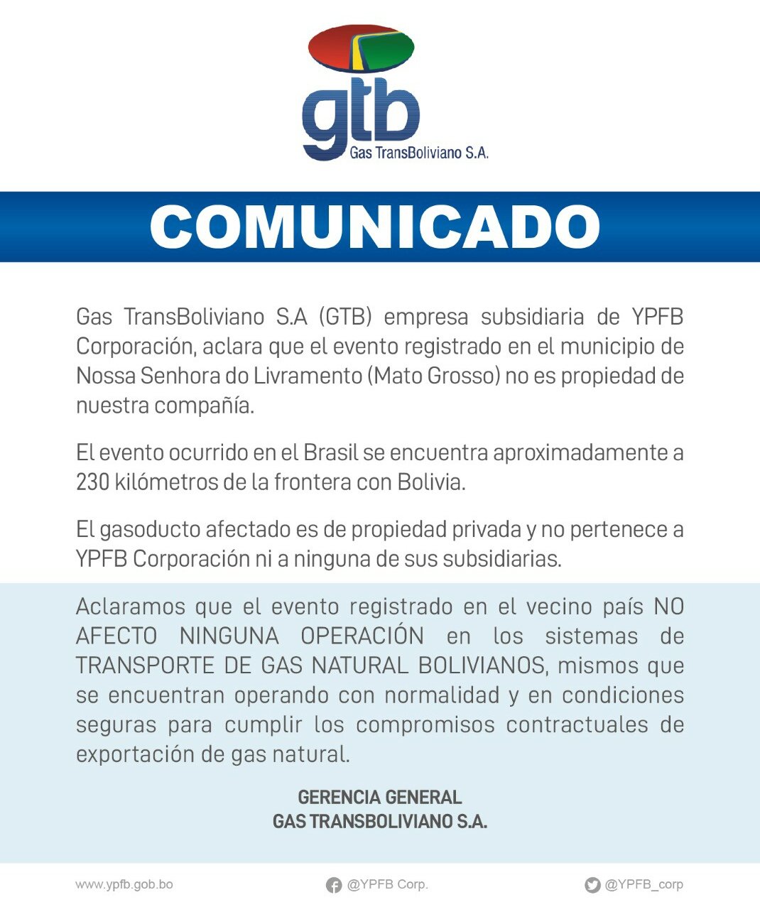 La Paz, 31 ene 2021 (ATB Digital).- A través de un comunicado en su página de Facebook, Yacimientos Petrolíferos Fiscales Bolivianos (YPFB) aclaró que el evento registrado en el municipio de Nossa Senhora do Livramento (Mato Groso) no afectó ningún gasoducto, sitio operativo, ni operaciones de la empresa.
