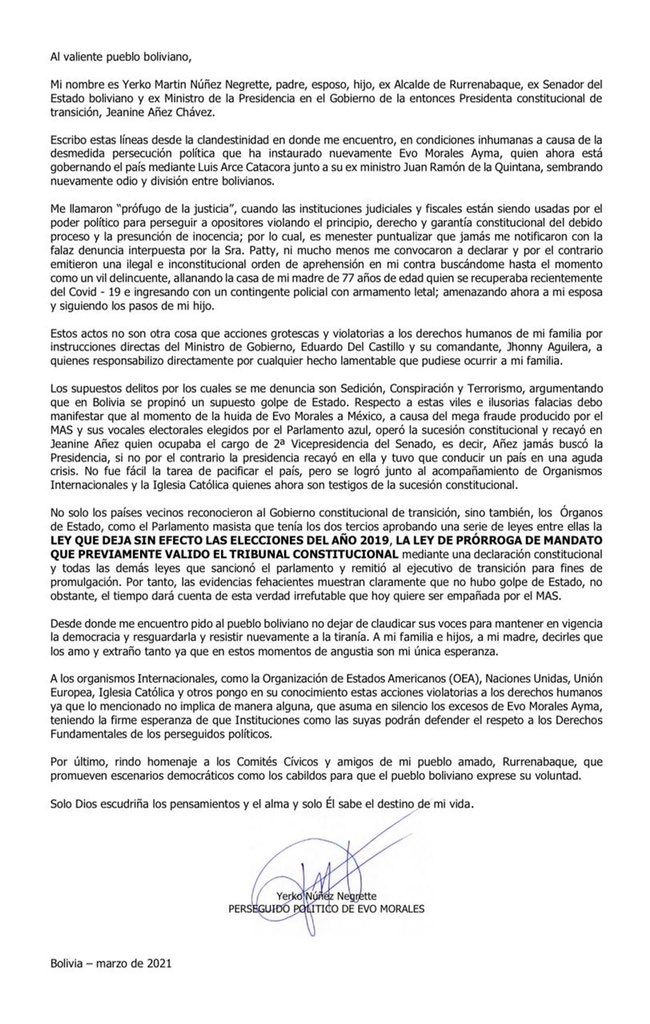 “Escribo estas líneas desde la clandestinidad en donde me encuentro, en condiciones inhumanas a causa de la desmedida persecución política que ha instaurado nuevamente Evo Morales Ayma, quien ahora está gobernando el país mediante Luis Arce Catocora junto a su ex ministro Juan Ramón de La Quintana, sembrando nuevamente odio y división entre bolivianos”, dice la nota.
