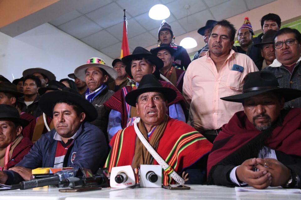Rodeado de dirigentes nacionales y departamentales, el dirigente campesino Lucio Quispe hizo pública la resolución que se suma similares determinaciones asumidas por organizaciones como la Confederación de Pueblos Indígenas del Oriente Boliviano (Cidob), el Bloqueo Oriente, el Consejo Departamental Originario de Markas y Ayllus del Chuquiago Marca (Codemac) La Paz.