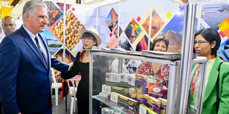 Durante el primer día de la feria, que se desarrolla entre el 6 y 11 de noviembre, el estand boliviano recibió la visita del presidente de la República de Cuba, Miguel Díaz-Canel, quien además de observar la oferta exportable boliviana, se interesó por los bloques de sal procedentes del salar de Uyuni, uno de los mayores atractivos turísticos del país.