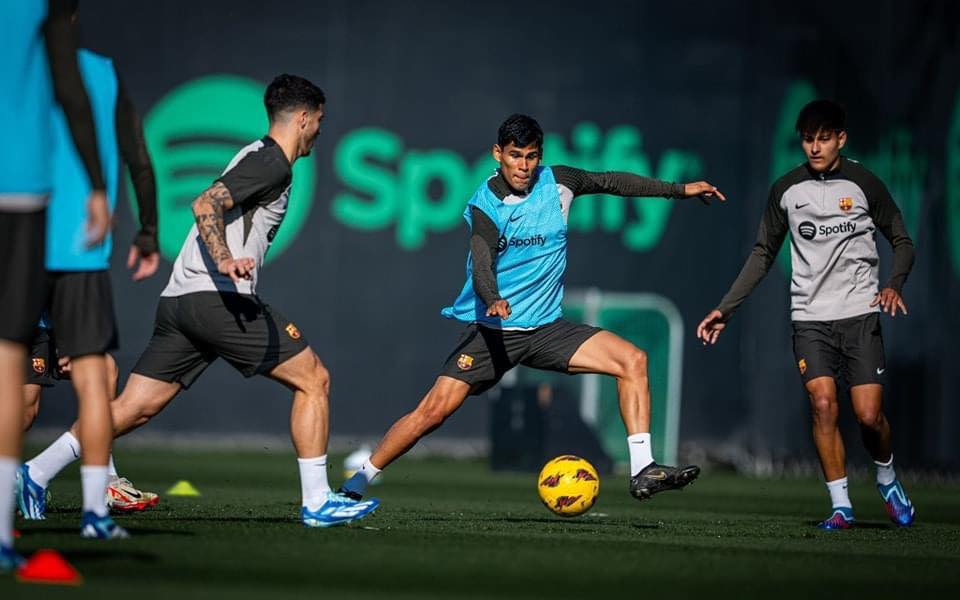 La Paz, 24 nov 2023 (ATB Digital).- El delantero de raíces bolivianas, Jaume Cuéllar, entrena con el primer plantel del FC Barcelona. El seleccionado nacional firmó con la filial del azulgrana que participa en la tercera categoría del fútbol español, pero esta semana el entrenador Xavi Hernández lo quiso ver en el día a día.