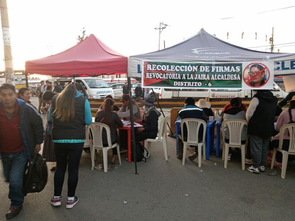 Al menos 100 puntos para la recolección de firmas se instalaron en diferentes distritos de El Alto´. Uno de ellos está en la calle 2, entre las avenidas 6 de Marzo y Héroes del Kilómetro Siete, adonde las personas se asoman para dejar su firma. Aseguran que están disconformes con la gestión de la alcaldesa alteña.