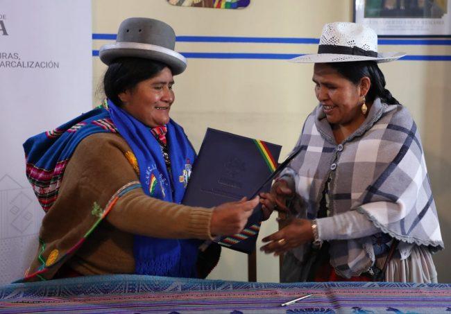 Por su parte, la Secretaria Ejecutiva de la Confederación Nacional de Mujeres Campesinas Indígenas Originarias de Bolivia “Bartolina Sisa”, Guillermina Kuno Huanca, se comprometió a trabajar de manera orgánica junto al Ministerio de Culturas, Descolonización y Despatriarcalización y destacó la importancia de la firma de este convenio porque, también, permitirá fortalecer la organización de las mujeres a nivel departamental y nacional.