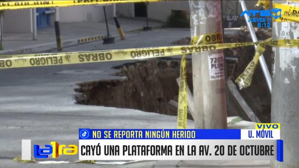 La Paz, 11 de ene 2024 (ATB Digital).- Tras la caída de una plataforma de una construcción al finalizar la Av. 20 de Octubre, a la altura de la conexión con la Av. Kantutani, la Alcaldía de La Paz acordonó el sector con personal del Grupo de Atención de Emergencias Municipales (GAEM) y desvía el tráfico vehicular con efectivos de la Guardia Municipal de Transporte mientras se realizan las evaluaciones de lo ocurrido en el sector.