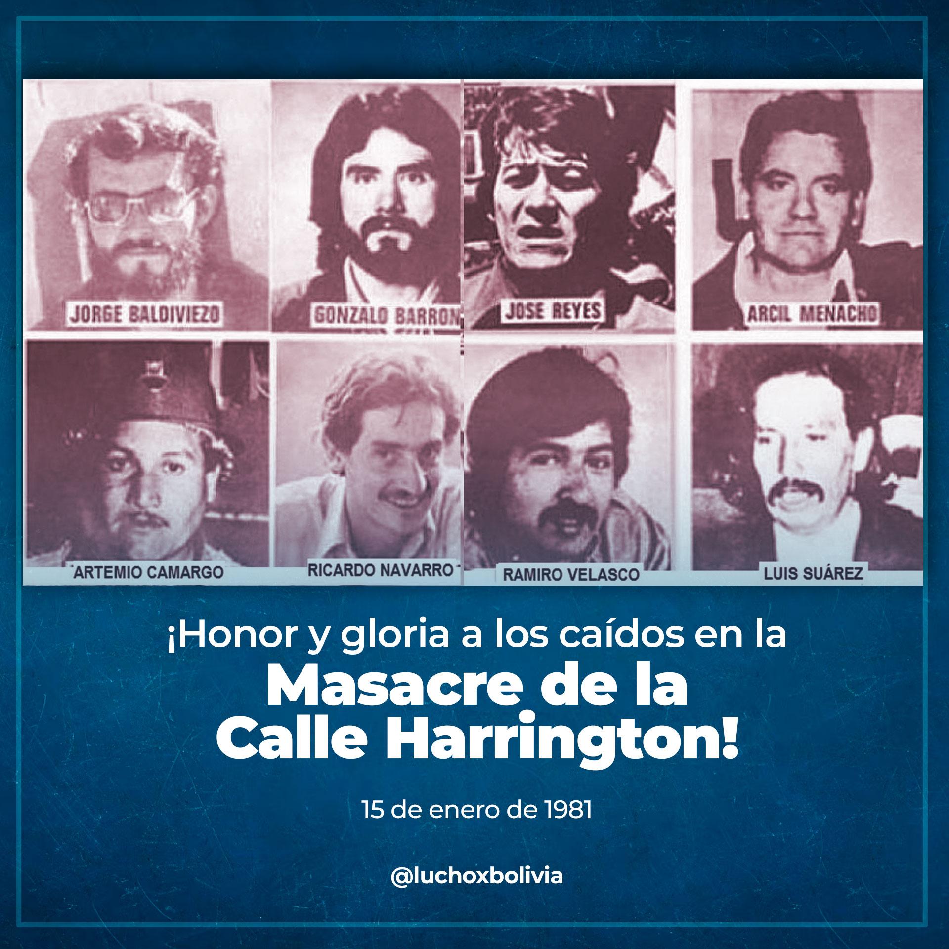 El 15 de enero de 1981, los dirigentes miristas Artemio Camargo, Ramiro Velasco, Jorge Baldivieso, Ricardo Navarro, Gonzalo Barrón, Luis Suárez, Arcil Menacho y José Reyes fueron torturados y asesinados por paramilitares en un domicilio de la Calle Harrington. Llegaron en dos jeeps y varias furgonetas e ingresaron al domicilio, mientras otro grupo de paramilitares armados había rodeado el manzano y un tercer grupo ingresado a las casas vecinas bloqueando el barrio.