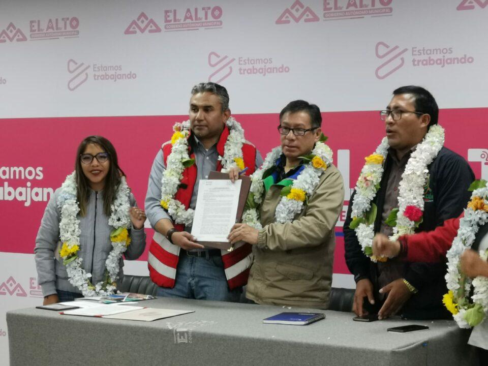 Autoridades de la Alcaldía de El Alto y el director ejecutivo del FNDR, Fernando Mita, suscribieron este viernes el contrato de financiamiento con la participación de representantes del Control Social y Junta de Vecinos del Distrito 6.