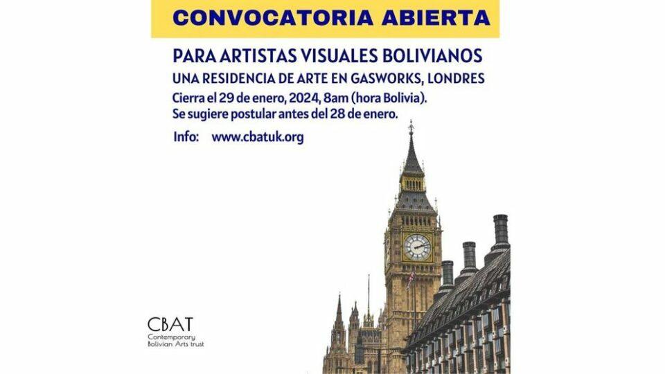 Se trata de una residencia que ofrece la oportunidad para que un artista investigue y desarrolle nuevas creaciones en Londres, mientras es parte de eventos y talleres participativos que involucren al público directamente con el artista y su obra. El programa tiene una duración de tres meses y tendrá inicio del 30 septiembre hasta el 16 diciembre 2024. La convocatoria es abierta, pero se priorizará a quienes no tuvieron oportunidad de realizar este tipo de trabajos en Londres antes. Se exige un nivel básico de inglés hablado y la beca incluye pasajes, estadía, material, tarjeta de viaje y otros. Mayores detalles: web o Facebook de CBAT Contemporary Bolivian Arts Trust.