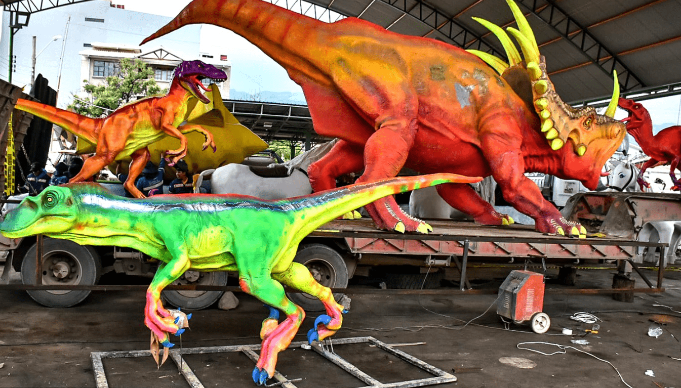 Dos carrozas incluirán estructuras con dinosaurios, y otras dos estarán inspiradas en la fiesta del Carnaval. Tendrán una altura aproximada de 5 metros.