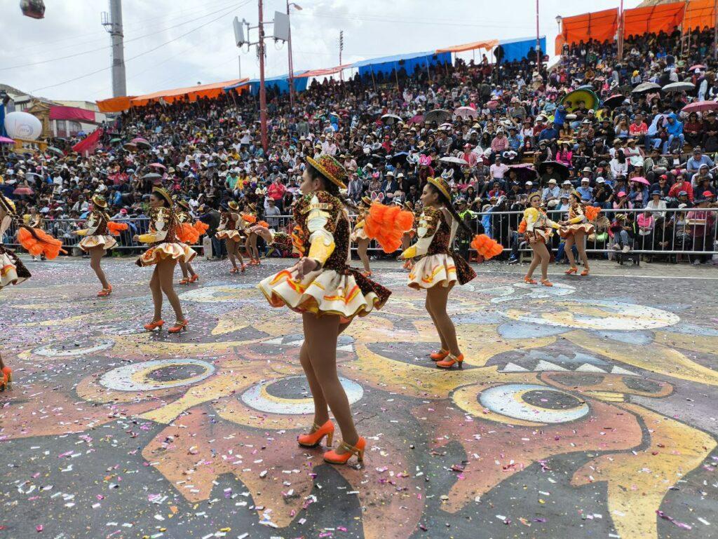 Un bloque conformado por “chinas” y “caporales” resaltó por sus colores vibrantes entre el rojo y verde. Los portadores de la vestimenta expresaron su devoción ejecutando pasos en conjunto mientras cientos de espectadores los rodeaban.