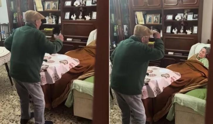 El video muestra al abuelo, ataviado con una boina y repleto de alegría, bailando para animar a su esposa, quien lo observa con atención a pesar de los estragos de la enfermedad. La nieta, conmovida por la ternura de la escena, graba el episodio y comparte el amor especial que su abuelo brinda a su mujer en situaciones difíciles.