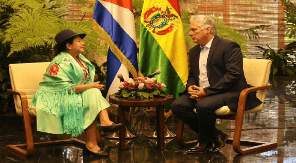 “En el marco de su visita oficial a la República de Cuba, la Ministra de Relaciones Exteriores, Celinda Sosa Lunda, sostuvo un encuentro con el Presidente Miguel Díaz-Canel Bermúdez, con el objetivo de estrechar y fortalecer las relaciones bilaterales entre ambos pueblos hermanos”, informó la Cancillería de Bolivia, en sus redes sociales.