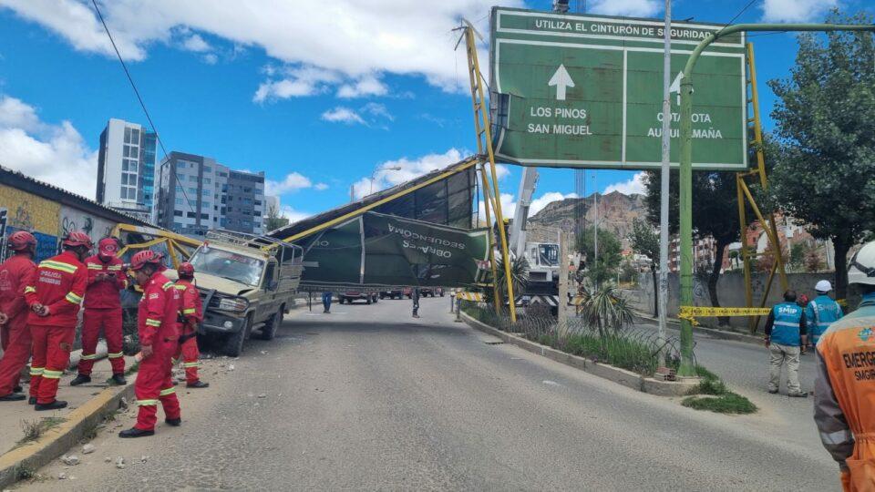 “Nosotros como Gobierno Municipal de La Paz nos haremos parte por el daño a la infraestructura pública. Para desmontar toda la infraestructura metálica, usamos maquinaria pesada, una grúa de 25 toneladas de capacidad, una retroexcavadora, un camión canasta, trabajaremos un par de horas más para habilitar al tráfico vehicular”, afirmó el secretario, según una nota institucional.