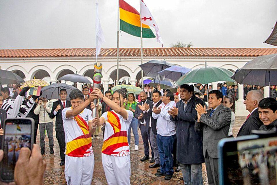 Los encargados de portar el símbolo bolivariano fueron los atletas chuquisaqueños Gerson Laura, de pelota vasca, y Daniela Daza, de taekwondo, quienes fueron escoltados por los otros 40 deportistas capitalinos que engrosarán las distintas selecciones nacionales que integrarán en los Juegos.