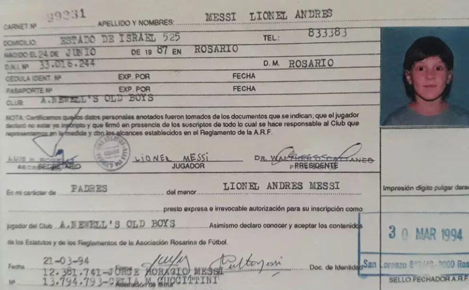 Un día como hoy, hace treinta años, la ARF incluía a Messi en la categoría 1987 de la Lepra, con el aval de sus padres Jorge y Celia Cuccittini, que de antemano habían llevado al pichón de crack al club de su barrio, Abanderado Grandoli, por donde también habían pasado sus hermanos mayores Rodrigo (también jugó en Newell’s) y Matías. La foto carnet con ojos bien abiertos, el sello azul con la data del 30 de marzo del 94, la firma de Leo con el domicilio fijado en su antigua casa en Rosario ubicada sobre la calle Estado de Israel al 500 (hoy llamada Lavalleja a esa altura) y la rúbrica del por entonces presidente leproso Walther Cattáneo representan un documento invaluable para la historia del deporte.