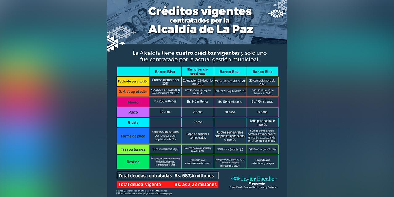 Javier Escalier, concejal, declaró: “Los créditos oscilan a una tasa de interés del 5% con pagos semestrales de amortización de capital e interés. De esta forma, con el último contrato de préstamo suscrito con el Banco Bisa por 175 millones de bolivianos, la Comuna debe erogar cada año 9,5 millones solo en el pago de los intereses, y en los nueve años restantes los paceños habrán pagado 85,8 millones de bolivianos, el 49% del total de la deuda”.