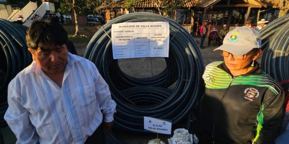 Los ministros de Defensa, Edmundo Novillo; de Medio Ambiente y Agua, Humberto Alan Lisperguer, y viceministros de Estado, a nombre del Gobierno nacional, entregaron alimento balanceado, geomembranas, politubos, bombas (sumergibles), tanques de 5.000 litros de capacidad, filtros vela, bebederos, generadores 10 kva, alambres de púas, tanques de 3.500 litros, pastillas potabilizadoras y motobombas para 37.448 familias damnificadas por la sequía, apoyo que representa una inversión de Bs 3.320.287,75.