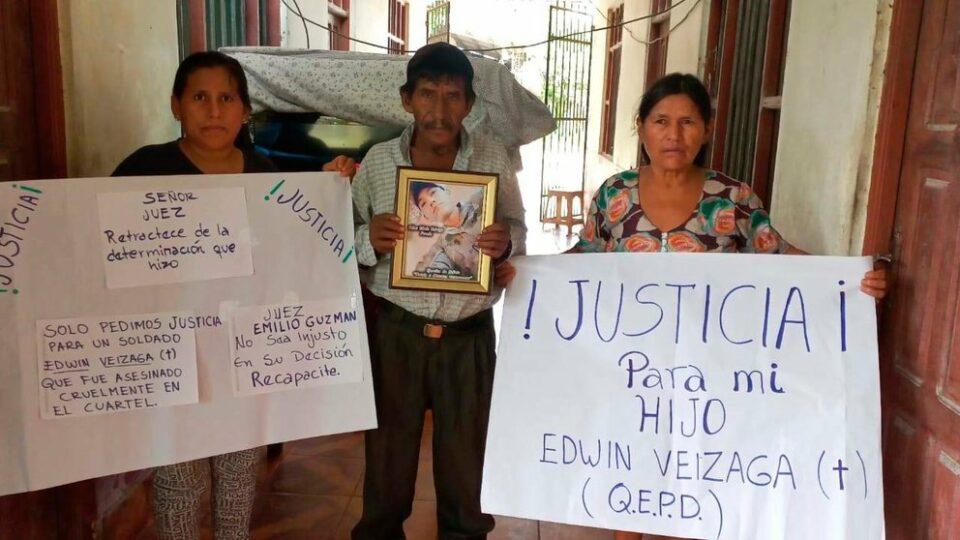 Los padres de la víctima, y otros familiares, mostraron carteles en los que piden que se haga justicia por la muerte de su hijo que prestaba el servicio militar en un cuartel de San Matías, Santa Cruz, ocurrida el 26 de diciembre de 2023.