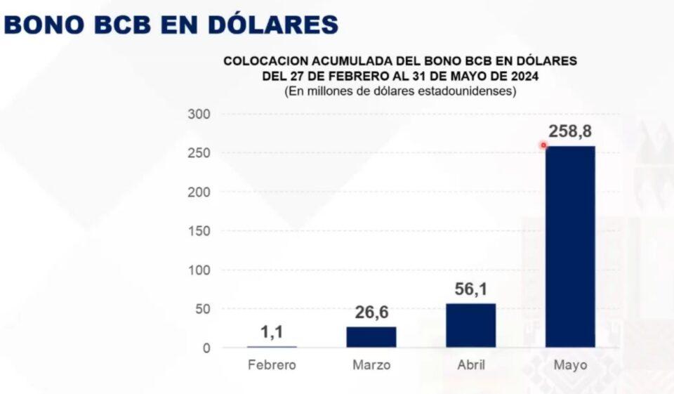 Si bien en febrero el BCB colocó bonos por $us 1,1 millones, en marzo subió a $us 26,6 millones y en abril a $us 56,1 millones. Solo en mayo las ventas superaron los $us 200 millones, llegando a un total de $us 258,8 millones.