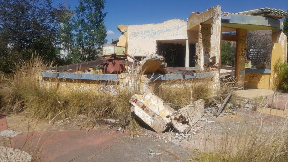 Frente al teatrín se encuentran las ruinas de lo que fue un restaurante. Todo su techo y muchas de las paredes se vinieron abajo. En medio solo quedan restos de botellas de alcohol vacías y desechos de fogatas.