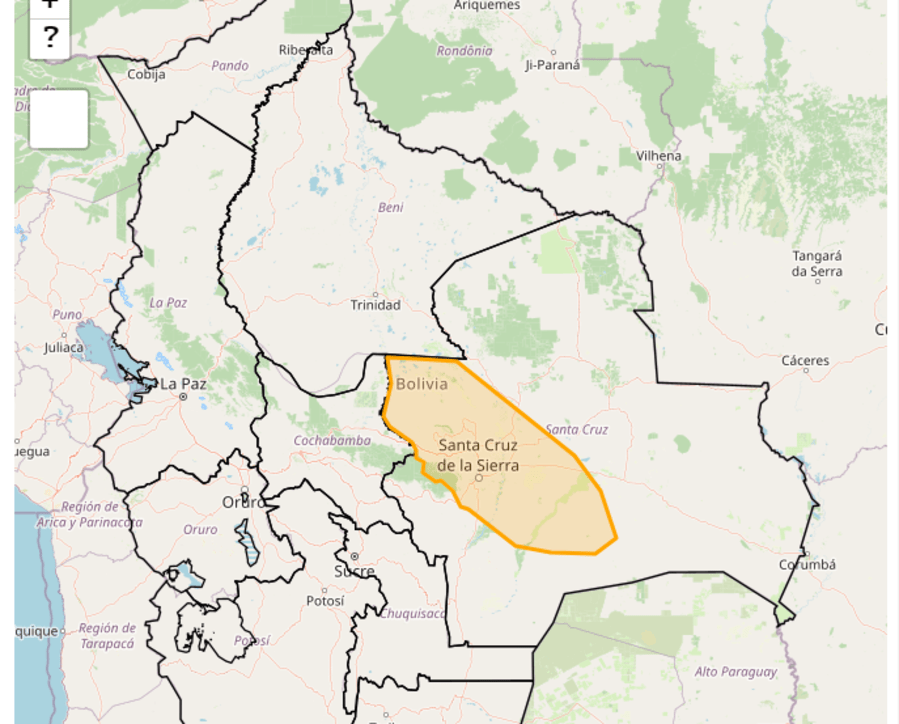 La alerta rige en las provincias Ibáñez, Warnes, Ichilo, Sara, Santiesteban, oeste de Cordillera y Chiquitos, y el sur De Guarayos y Ñuflo de Chávez.