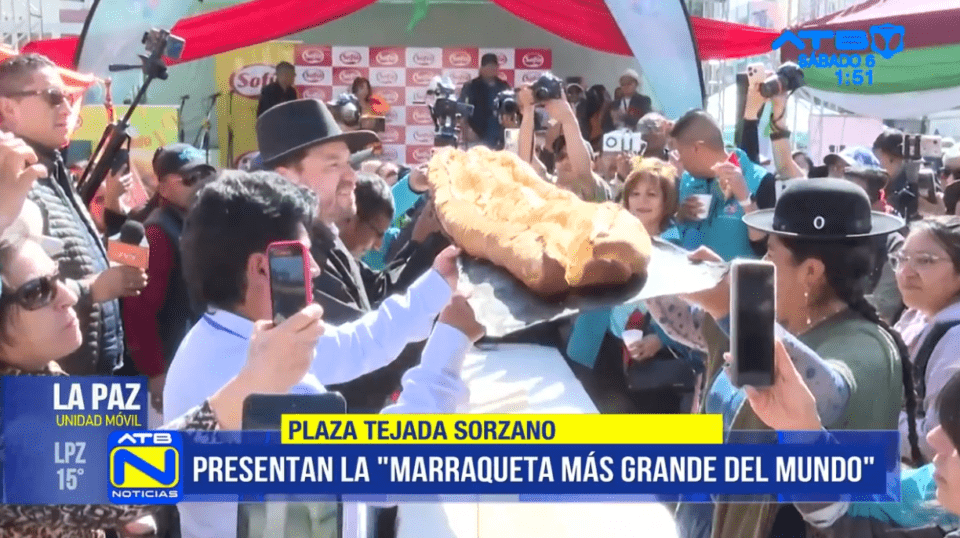 La Paz, 06 de jul 2024 (ATB Digital).- Las autoridades municipales, encabezadas por el alcalde Iván Arias, presentaron la “marraqueta más grande del mundo”. Américo Gemio, Secretario de Culturas, informó que esta marraqueta tiene una longitud de 3 metros con 10 centímetros y fue elaborada con un quintal de harina. Gemio elogió el trabajo de los panificadores y anunció que cada 6 de julio se celebrará el “Día de la Marraqueta”.