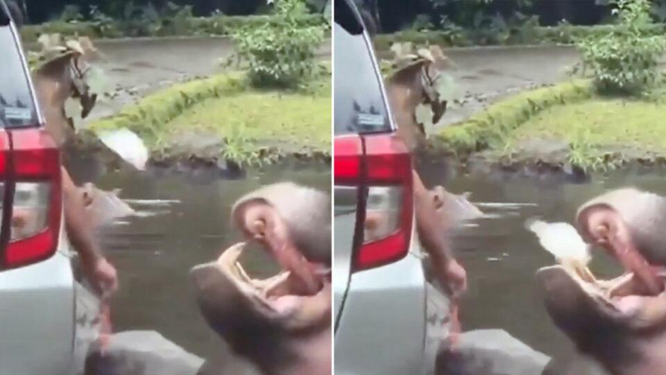 Un turista le tira una bolsa de basura a la boca de un hipopótamo y pone en peligro su vida