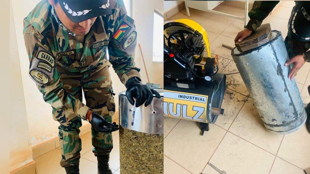 Durante el operativo, los efectivos vieron el compresor y, al inspeccionarlo, hallaron un cilindro en su interior que contenía una sustancia verdosa. Tras las pruebas, se confirmó que era marihuana. En total, secuestraron 24 kilos con 120 gramos de la sustancia.
