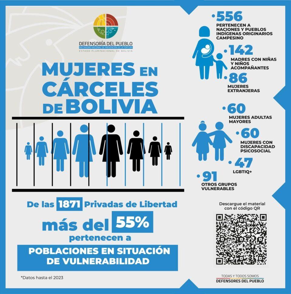 Según estos datos, 556 pertenecen a naciones y pueblos indígenas originarios campesinos; 142 viven con sus hijos dentro de los recintos penitenciarios; 60 son mujeres de la tercera edad; otras 60 padecen discapacidad psicosocial; 47 son de la comunidad LGBTIQ+.