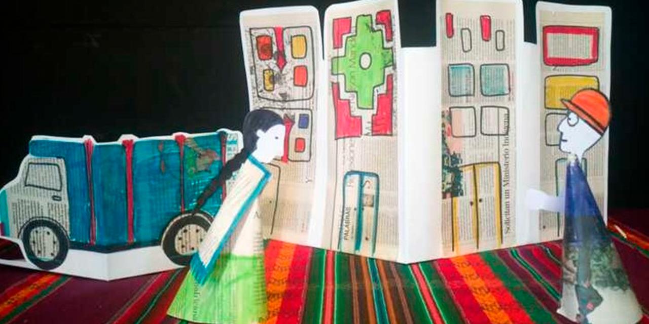 Los personajes son elaborados con papel reciclado mediante técnicas de papercraft, pop-up y paper cut, y cobran vida en un colorido escenario que refleja los mercados y minibuses.