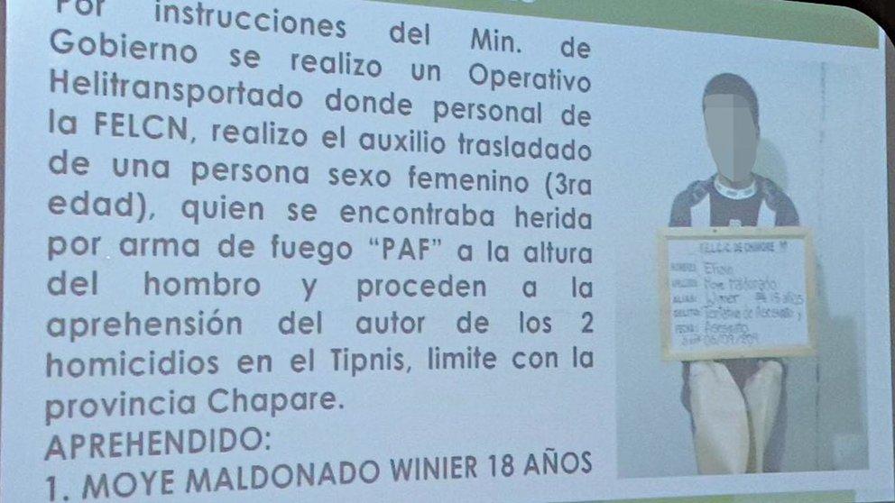Según la autoridad, por instrucciones del Ministerio de Gobierno se llevó a cabo un operativo helitransportado el 6 de septiembre. En esa operación, personal de la Fuerza Especial de Lucha Contra el Narcotráfico (FELCN) rescató a la mujer, que había sido herida en el hombro, y luego aprehendió al responsable, que también cometió el doble asesinato.