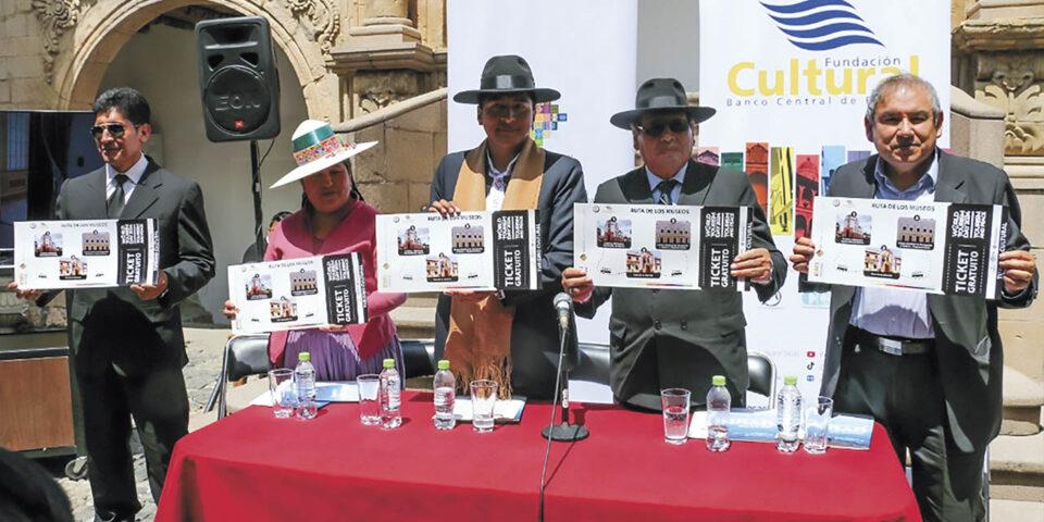 En instalaciones del patio principal del Museo Nacional de Etnografía y Folklore (Musef), una infraestructura que data de los tiempos de la colonia, el viceministro de Turismo, Hiver Flores, junto al presidente de la FC-BCB, Luis Oporto, lanzaron el evento turístico Ruta de Museos en Sucre, Rumbo al Bicentenario. La actividad también contó con la presencia del director general de la FC-BCB, Pavel Pérez, y la directora del Musef, Elvira Espejo.