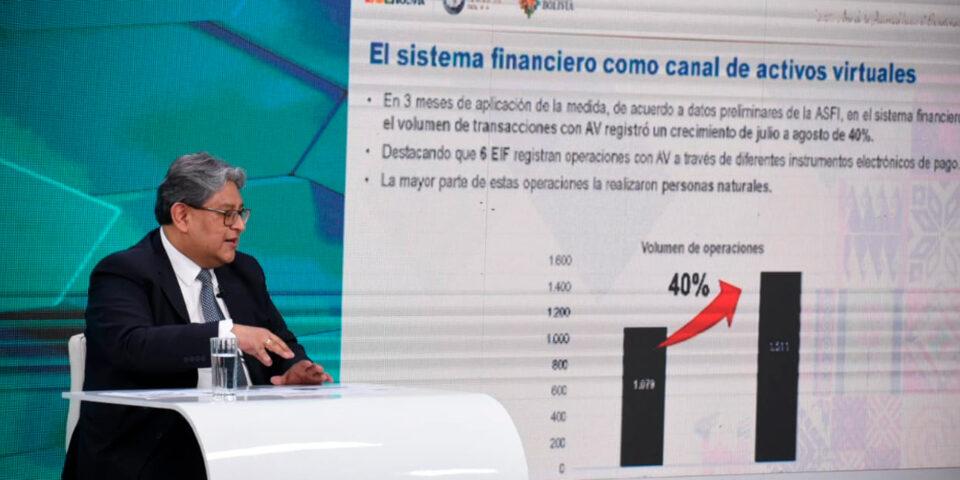“En ese estudio (de la Gafilat) se estima que en la economía boliviana existe como 1.000 millones de dólares, ¿no es cierto?, en materia de activos, de criptoactivos como tal. O sea, la población en Bolivia tiene en valor como 1.000 millones y la cantidad de personas, según este estudio, superan las 250.000 personas que tienen, de alguna forma, ya sea stablecoins o tienen alguna modalidad de activo virtual”, explicó en una entrevista con Bolivia Tv.