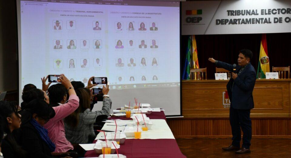 Ortíz explicó los alcances del Reglamento de Difusión de Méritos e Información de candidatos de la elección de autoridades del Órgano Judicial y Tribunal Constitucional Plurinacional en un taller con periodistas en Oruro, que versó sobre el sistema electoral y reglamentación de las elecciones judiciales 2024.