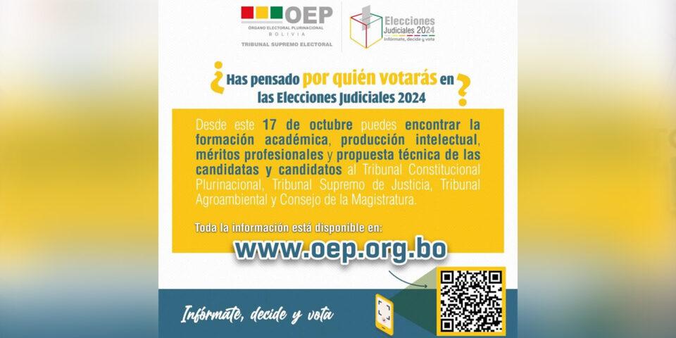 La Paz, 20 de oct 2024 (ATB Digital).- El Órgano Electoral Plurinacional (OEP) inició este domingo la difusión de méritos de los 127 candidatos a las elecciones de las altas autoridades del Órgano Judicial y Tribunal Constitucional Plurinacional (TCP) previstas para el 1 de diciembre.