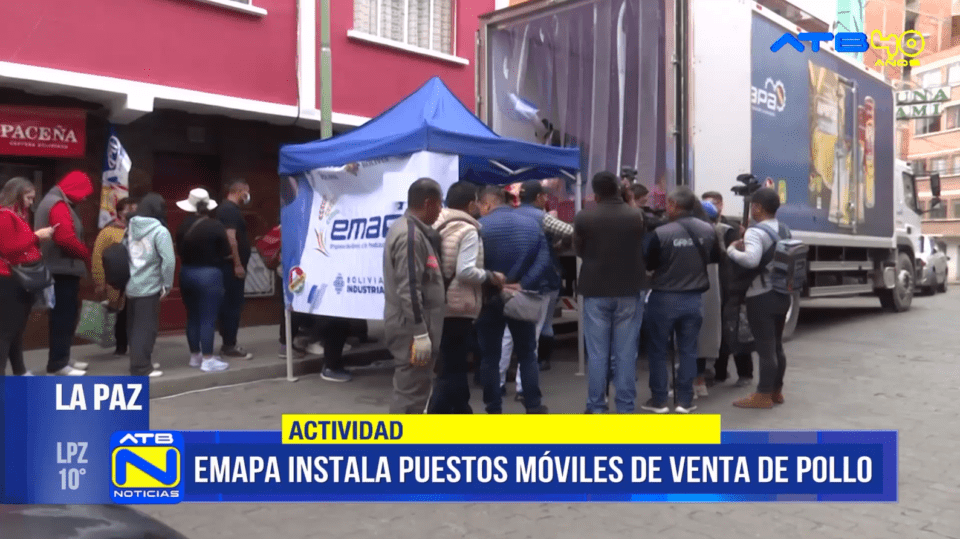 La Paz, 26 de oct 2024 (ATB Digital).- La Empresa de Apoyo a la Producción de Alimentos (EMAPA) instaló cinco puestos móviles para la venta de carne de pollo en distintos puntos de la ciudad de La Paz y El alto. La medida se lleva a cabo con la finalidad de garantizar el abastecimiento y comercialización del alimento, esto ante los bloqueos que impiden el traslado de los productos cárnicos al departamento paceño.