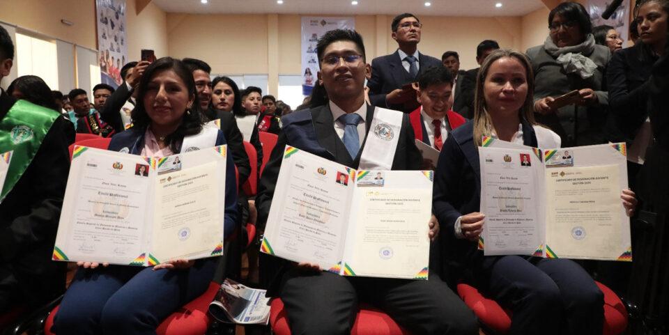 “Esta es una muestra de compromiso del Estado boliviano, para motivar e incentivar a cada uno (de los docentes en formación). Vamos a entregar la cantidad de 71 reconocimientos, además de 1 ítem correspondiente, para que puedan ingresar directamente a la inserción laboral”, señaló Veliz.