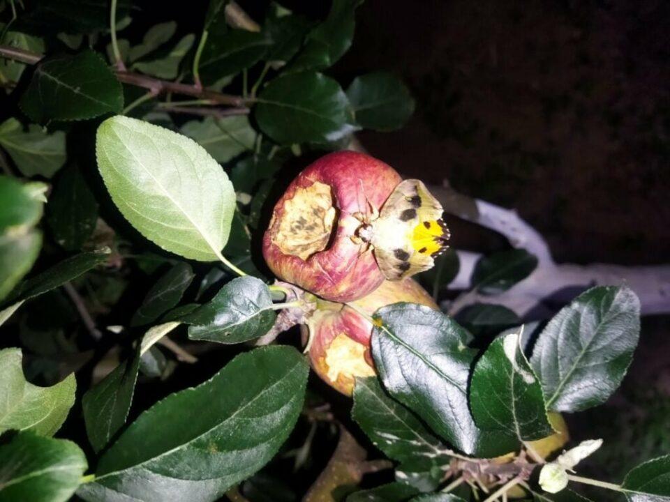 La mariposa nocturna (Achaea ablunaris) ingresa a los huertos frutales por la noche y daña la fruta que está en proceso de maduración.