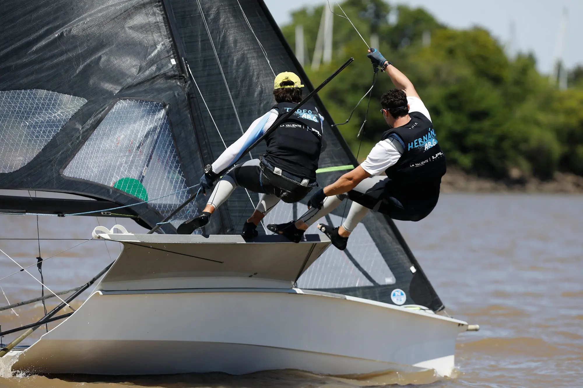 Sin embargo, a la distancia, a otra escala, furiosos, se advierten dos 49er, veloces veleros olímpicos para dos personas. En uno batallan Klaus Lange como timonel [uno de los cuatro hijos de la leyenda, Santiago Lange] y Calixto Varela como tripulante; en el otro, Tadeo Funes [dos títulos mundiales en 29er] y Hernán Paulucci.