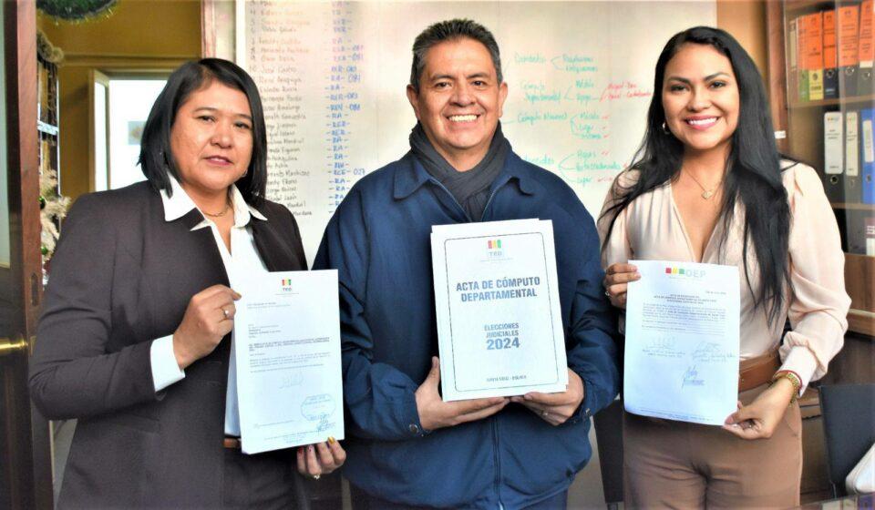 Los vocales de los tribunales electorales de Beni, Chuquisaca, La Paz, Oruro Pando y Tarija arribaron a La Paz y entregar las actas a Secretaría de Cámara del Tribunal Supremo Electoral, en cumplimiento a una de las últimas actividades del calendario electoral de la tercera elección judicial de Bolivia y la primera realizada de forma parcial.