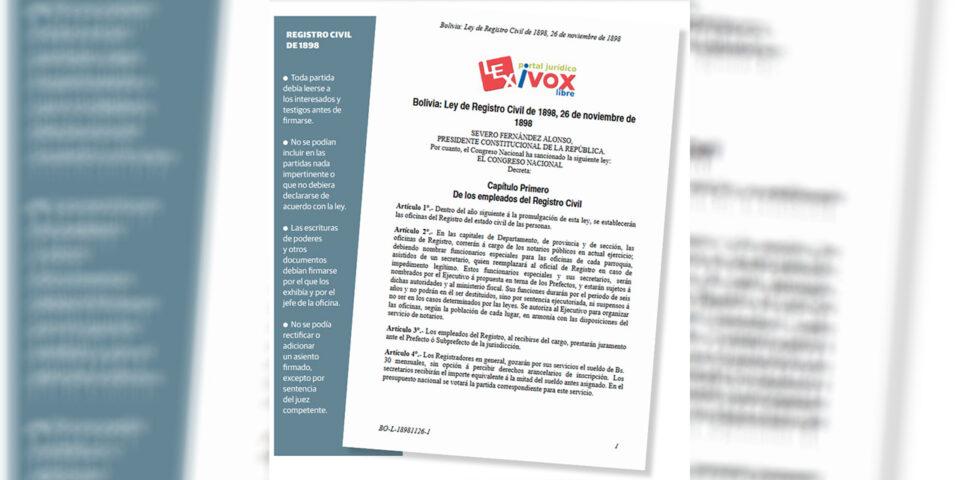 El Registro Civil de Bolivia fue creado el 26 de noviembre de 1898, aprobado por el entonces presidente de la República de Bolivia, Severo Fernández Alonso.