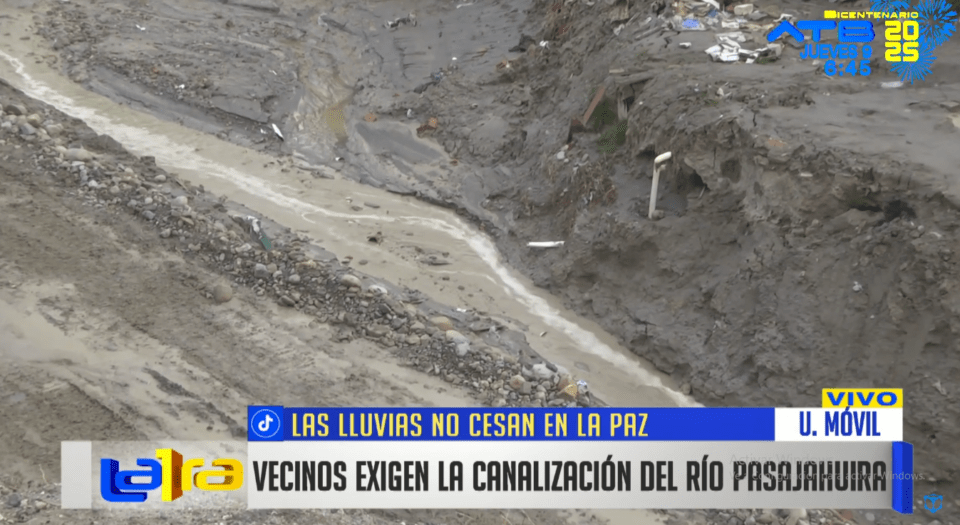 La Paz, 9 de enero 2024 (ATB Digital).- El Gobierno Autónomo Municipal de La Paz (GAMLP) y personal del Ejército lograron implementar una canalización para redirigir el agua proveniente de las intensas lluvias, evitando que afectara a las viviendas en la zona de Bajo Llojeta. Según los informes, más de 100 familias han sido impactadas por las inundaciones y la mazamorra que alcanzó a la zona la pasada gestión, y aunque se ha tomado acción, los residentes de la zona aún no se sienten completamente seguros debido a las lluvias constantes que persisten en la ciudad. Ante esta situación, los vecinos exigen la canalización del río Pasajahuira, ya que los desbordes de este cauce, producto de la temporada de lluvias, continúan afectando al sector.
