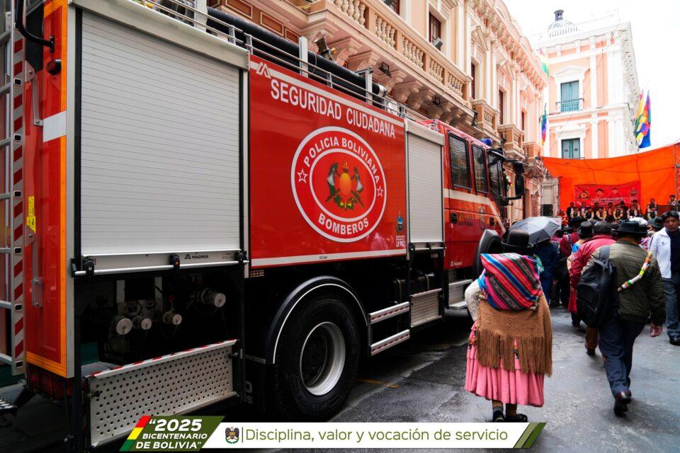 El equipamiento incluye vehículos, entre los que destaca la entrega de un carro bombero de origen europeo, que se destinará a la sofocación de incendios del área urbana y rural de La Paz.