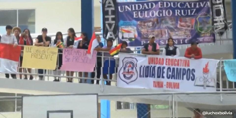 “Siempre contentos de estar aquí en La Chura Tarija. Hoy, venimos a Tarija a entregar la infraestructura de la unidad educativa Eulogio Ruiz, turno de la mañana, y unidad educativa Lidia Reynoso de Campos, turno de la tarde.¡Felicidades, Tarija!”, expresó Arce en un masivo acto.