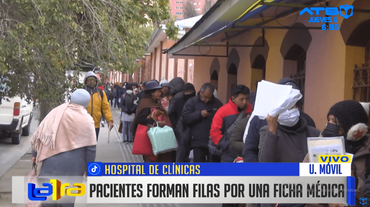 La Paz, 6 de febrero 2025 (ATB Digital).- En el Hospital de Clínicas de la ciudad de La Paz, se registró una gran cantidad de personas haciendo fila para obtener una ficha que les permita acceder a atención médica. Algunos pacientes informaron que tuvieron que pasar la noche a las puertas del hospital, mientras que otros llegaron desde las primeras horas de la madrugada con la esperanza de ser atendidos. Según la información proporcionada por el hospital, solo se disponen de 10 fichas para cada especialidad, lo que genera una alta demanda y largas esperas para los usuarios.