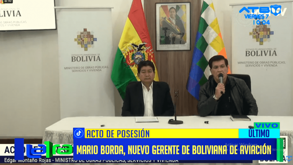 La Paz, 7 de febrero 2025 (ATB Digital).- El ministro de Obras Públicas, Edgar Montaño, posesionó a Mario Borda como el nuevo gerente general de Boliviana de Aviación (BOA), tras la salida de Ronald Casso. Montaño destacó la amplia experiencia en el sector de aviación de Borda.