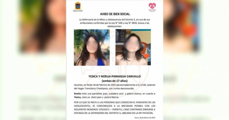 La Defensoría del Distrito 3 habilitó los números 67610671 y 74459751 para que cualquier persona que tenga información sobre el paradero de las adolescentes se comunique de inmediato.