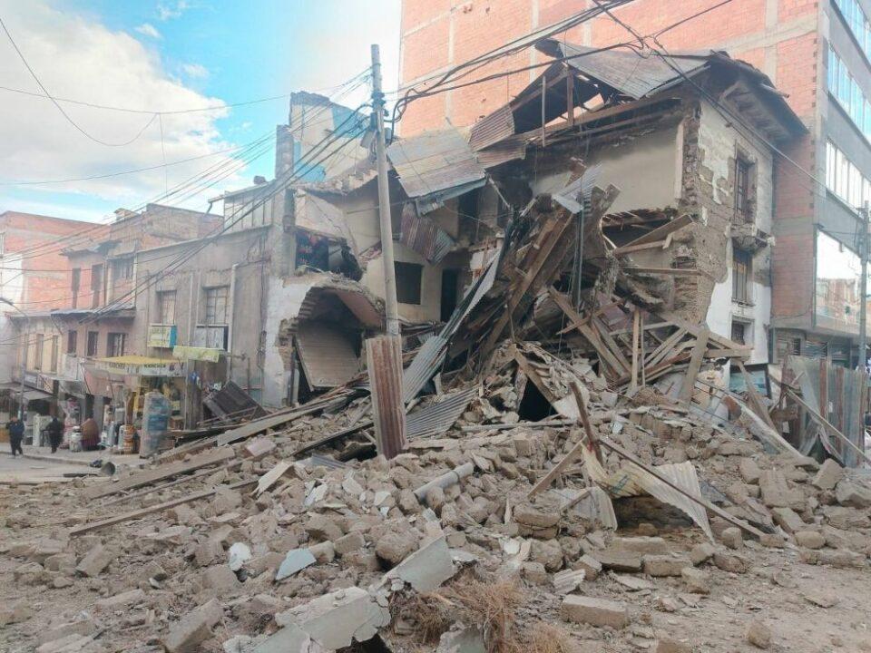 La casa de dos pisos se encontraba deshabitada y acordonada con calaminas. Personal de la Alcaldía de La Paz llegó al lugar para evaluar la situación y retirar los escombros que obstruyeron las céntricas vías.
